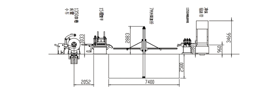 液壓上料小車→開卷機→接料鏟頭→整平主機→渡橋→NC偏擺定尺送料機→沖壓設備→圓片輸送帶(液壓系統、氣動系統、電控系統)
