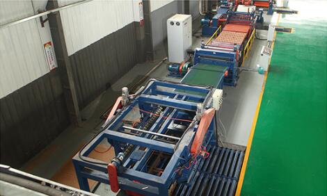 設備在工作時開卷機處于送料狀態,板料進入整平機校平后,再經電眼控制活套、側向機構進入NC定尺裝置,NC定尺裝置按設定好的尺寸定尺向后工序剪床送料;當NC送料達到設定尺寸時,設備停止送料同時將信號傳給剪床,由剪床將板料切斷,切下的板料經輸送裝置送入集料架整齊堆垛,堆垛鋼板的升降臺可隨堆垛鋼板高度的增加而自動下降;當堆垛鋼板張數達觸摸屏設定值時,生產線自動停機,此時人工控制降下升降臺,將出料臺車開出,同時開進另一臺出料臺車,即進入下一工作循環。